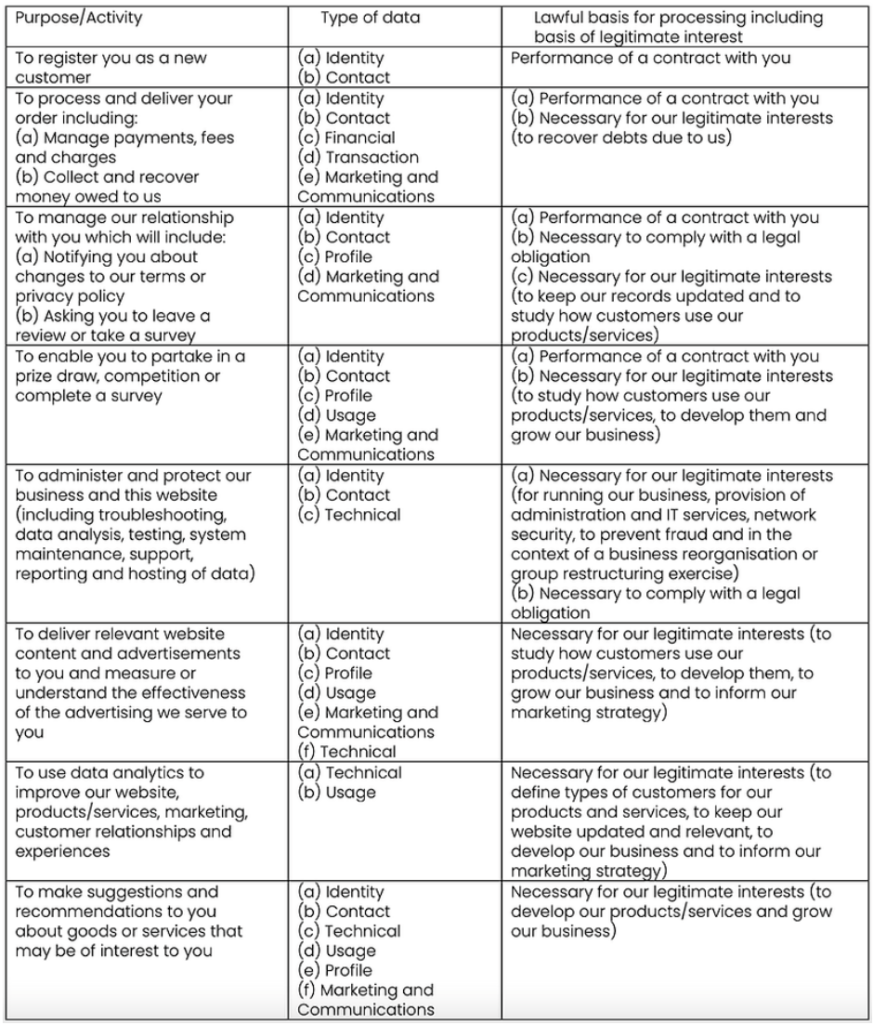 We have set out below, in a table format, a description of all the ways we plan to use your Personal Data, and which of the legal bases we rely on to do so. We have also identified what our legitimate interests are where appropriate.